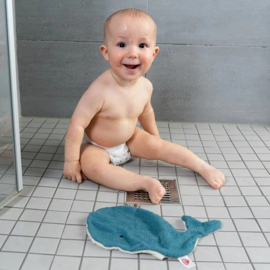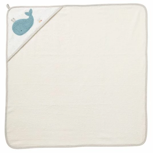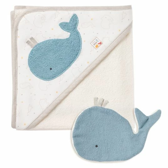 - bestehend aus Kapuzenbadetuch und Waschhandschuh mit Wal-Motiv
