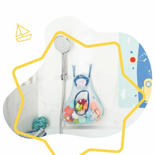 Auch während dem Babybad darf unterhaltsames Spielzeug nicht fehlen. Doch wohin soll es nach dem Wasserspaß aufgeräumt werden? Das Badabulle Aufbewahrungsnetz für Bade-Spielzeug – Ocean ist der ideale Platz dafür nach dem Spielen. Mit 2 praktischen Saugnäpfen lässt es sich platzsparend an der Wand befestigen. Das Spielzeug kann durch die große Öffnung von Deinem kleinen Spatz in das Netz gelegt werden. So lernt er durch die Routine auch im Badezimmer Ordnung zu halten.
