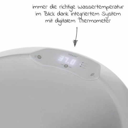 Damit sich Dein kleiner Spatz in der Badewanne rundum wohl fühlt, sollte das Badewasser genau die richtige Temperatur haben. Mit der bébé-jou Baby-Badewanne Sense Edition in Light Grey hast Du sie immer im Blick: Der Badewannenstöpsel ist mit einem praktischen System ausgestattet, dass neben der Raumtemperatur auch die Wassertemperatur misst. So zeigt Dir das integrierte, digitale Thermometer an der Badewanne genau an, wie warm das Wasser ist.