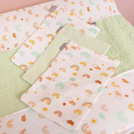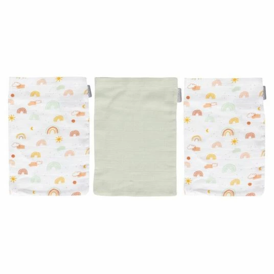 Mit dem Musselin Waschhandschuh im 3er Pack – Rainbow Sky von bébé-jou kannst Du Dein Baby besonders sanft reinigen. Mit einer Hand kannst Du bequem in den weichen Waschlappen schlüpfen und so mit der anderen Dein Baby beim Waschen sicher festhalten. Anschließend lasst sich der Waschhandschuh an der Schlaufe zum Trocknen aufhängen. Das Material aus Bambus und Baumwolle ist super soft, hautfreundlich und saugfähig und somit ideal für die tägliche Pflege Deines Babys geeignet. Die hübschen Allover-Motive machen sie zum Hingucker für Groß und Klein.