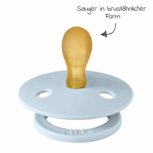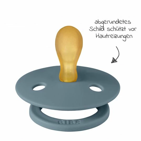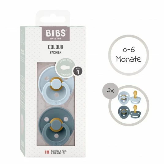 Das 2-teilige Schnuller-Set Colour aus Naturkautschuk 0-6 M in Babyblue / Petrol von BIBS mit samtweichem, flexiblem und hautschonendem Material vermittelt Deinem kleinen Spatz ein natürliches Sauggefühl. Durch die symmetrische Form ist der Schnuller kiefergerecht und unterstützt eine gesunde Zahnentwicklung. Zudem beugt der Schnuller Saugverwirrungen vor und Du kannst problemlos zwischen Brust und Schnuller wechseln.