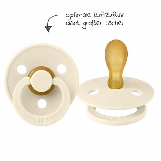Das 2-teilige Schnuller-Set Colour aus Naturkautschuk 6-18 M in Sage / Ivory von BIBS mit samtweichem, flexiblem und hautschonendem Material vermittelt Deinem kleinen Spatz ein natürliches Sauggefühl. Durch die symmetrische Form ist der Schnuller kiefergerecht und unterstützt eine gesunde Zahnentwicklung. Zudem beugt der Schnuller Saugverwirrungen vor und Du kannst problemlos zwischen Brust und Schnuller wechseln.