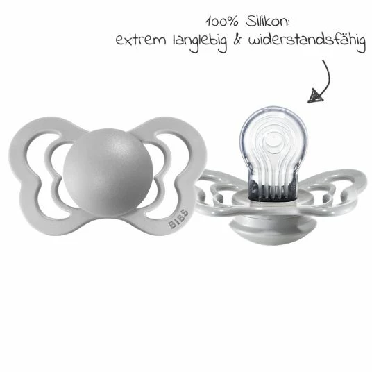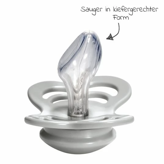Durch den kiefergerechten Sauger aus Silikon besteht der Schnuller aus einem besonders langlebigen und extrem widerstandsfähigem Material. Im Unterschied zu Latex dehnt sich Silikon nicht aus und behält die Form bei.