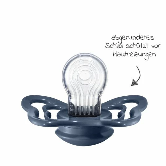 Das leicht abgerundete Schild des Schnullers ist mit Lüftungslöchern versehen. So kommt ausreichend Luft an den kleinen Mund und die zarte Babyhaut wird vor Hautreizungen geschont. Der Schnuller schmiegt sich dabei sanft an die Haut Deines Babys an und verhindert Druckstellen – so fühlt sich Dein Baby rundum wohl!