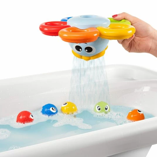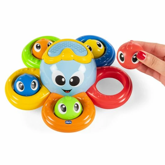 Das Badespielzeug Billy der Oktopus schwimmt auf der Wasseroberfläche und hat 5 springende Fisch-Freunde dabei. Billy`s Tentakeln sind unterschiedlich farbig, genau wie die 5 Fische – hier kann Dein Kleines die Fische in die Tentakeln des Oktopusses einsetzen und die Zuordnung der Farben trainieren. Wenn man Billy unter Wasser taucht und ihn wieder heraus hebt, wird ein fantastischer Regeneffekt kreiert. Da ist jede Menge Badespaß garantiert egal ob in der Badewanne oder im Planschbecken.
