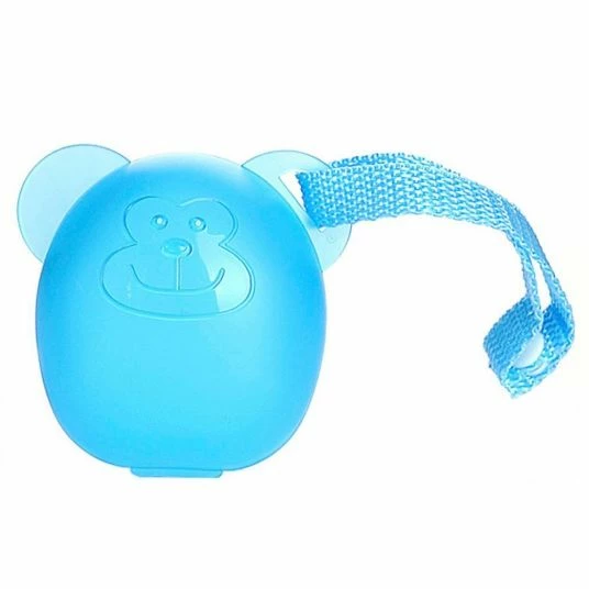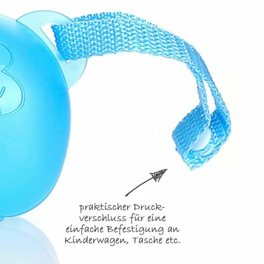 Die blaue Schnullerbox von Diago bewahrt bis zu zwei Schnuller hygienisch auf und kann ganz einfach per Druckverschluss an Kinderwagen oder Wickeltasche befestigt werden. So wird die Box mit dem niedlichen Äffchen-Gesicht zum praktischen Begleiter für unterwegs.