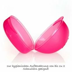 Neben der sauberen Aufbewahrung der Schnuller, können Sie diese auch schnell und einfach in der Schnullerbox sterilisieren. Dazu einfach einen Teelöffel Wasser in den unteren Teil der Box füllen; Schnuller einlegen und die Box schließen. Anschließend legen Sie die Schnullerbox in Ihre Mikrowelle, stellen diese auf die höchste Stufe (etwa 800 – 1100 Watt) und schalten sie für 90 Sekunden ein. Danach zwei Minuten zum Abkühlen abwarten. Beim Öffnen darauf achten, dass heißer Dampf entweichen kann und eventuelles Restwasser weggießen.