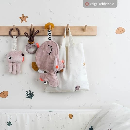 An einem Klettverschluss oder einem Gummiband kann außerdem Baby’s Schnuller mit oder ohne Griff angebracht werden. Er ist so schnell griffbereit und geht nicht so leicht verloren. Mit dabei ist außerdem eine Flosse als weicher Beißring aus Silikon – besonders beim Zahnen ist dieser sehr willkommen. Er stimuliert, beruhigt und hilft dabei, die Schmerzen etwas zu lindern.