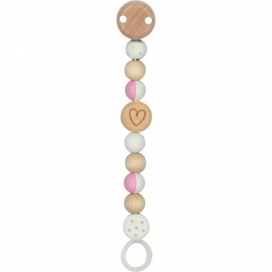 Der Schnuller wird an einem Kunststoffring angebracht. Durch das niedliche Design mit einem Herzchen sowie dezenter Farbgebung passt sie zu jedem Babyoutfit und wird schnell zum süßen Hingucker. Die Schnullerkette besteht aus Holz und kann mit einem feuchten Tuch gereinigt werden.