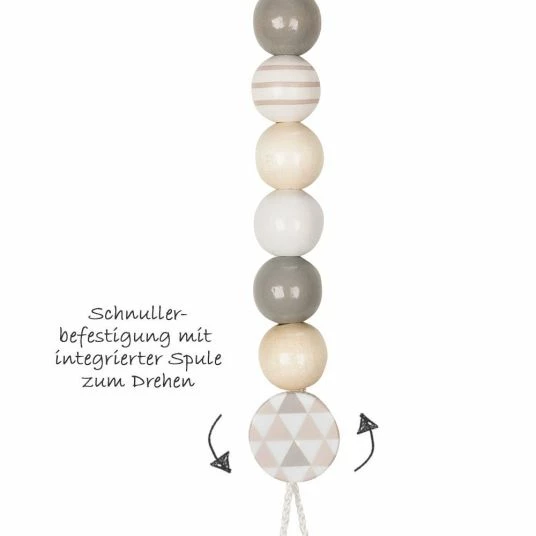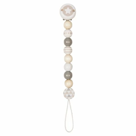 Mit der modernen Holz-Schnullerkette Stern von Heimess geht der Schnuller Deines Babys nicht mehr verloren. Sie ist für Schnuller mit und ohne Greifring geeignet. Zur Befestigung musst Du einfach an der integrierten Spule drehen, schon passt sich die Schlaufe entsprechend an. Anschließend kannst Du die dezente und elegante Schnullerkette mit dem Clip auf der anderen Seite an der Kleidung Deines Kindes oder am Kinderwagen befestigen. So fällt der Schnuller nicht mehr auf den Boden und wird schmutzig oder verschwindet einfach spurlos.
