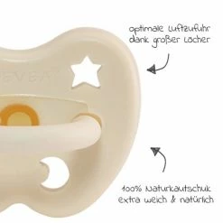 Das Material aus 100% Naturkautschuk und natürlichen Farbpigmenten ist seidig glatt und angenehm weich. So wird der Schnuller sehr gerne angenommen, hinterlässt keine Abdrücke und schont empfindliches Zahnfleisch. Gleichzeitig ist er sehr robust, so dass ihm kleine Babyzähnchen nichts anhaben können. Durch die nahtlose Verarbeitung ist der Schnuller besonders hygienisch und lässt sich in heißem Wasser reinigen.