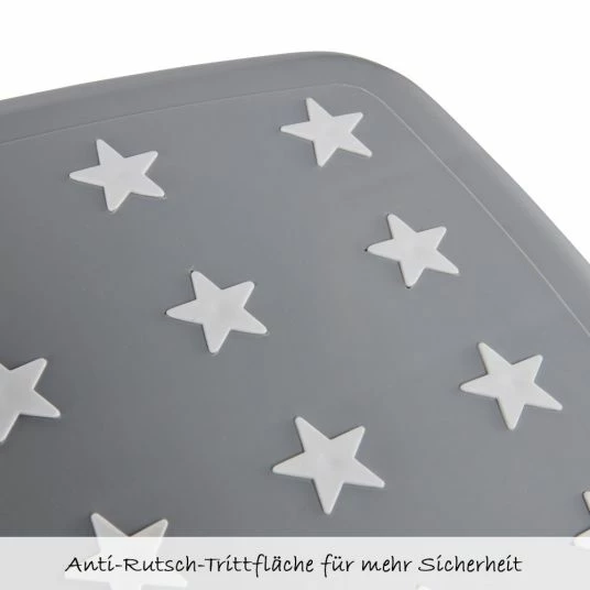 Es fehlen noch ein paar Zentimeter bis zum Waschbecken im Bad oder bis zur Küchentheke? Damit Dein Weltentdecker auch diese Stellen im Alltag alleine gut erreichen kann, bietet ihm der rutschfeste keeeper Tritthocker Igor – Stars in Cosmic Grey 21 cm mehr Höhe. Da der Tritthocker so leicht ist, kann Dein Kleines ihn selbst dorthin tragen, wo er gerade gebraucht wird. Die 2 Stufen und die genoppten Anti-Rutsch-Flächen auf den Stufen gewährleisten ein einfaches sowie sicheres Auf- und Absteigen.