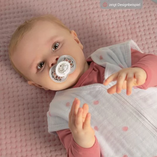 Das kiefergerechte Saugteil hilft Zahn- und Kieferfehlstellungen vorzubeugen. Außerdem besteht es aus SkinSoft-Silikon, das sich besonders weich und vertraut anfühlt und so von 94% der Kinder instinktiv akzeptiert wird.*¹ Sowohl Saugteil als auch Schnullerschild haben eine symmetrische Form, weshalb der Schnuller nie falsch herum im Mund liegt. Das Schild besitzt zusätzlich Belüftungslöcher, Noppen auf der Innenseite sowie abgerundeter Ränder und beugt sowohl Abdrücken als auch Hautreizungen vor. Der Schnullerknopf ist für kleine Babyhände einfach zu greifen und zu halten, aber gleichzeitig so flach, dass der Schnuller für Baby in jeder Lage bequem ist.