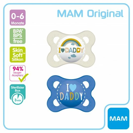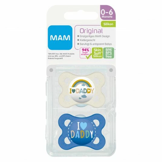 2 MAM Schnuller Original – Silikon 0-6 M – I Love Daddy in Beige & Blau