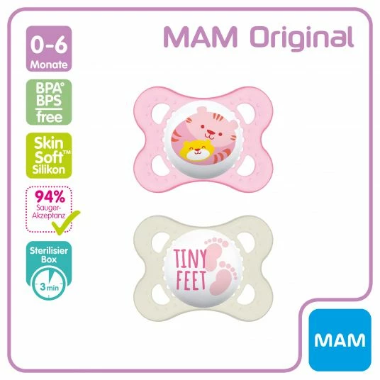 2 MAM Schnuller Original – Silikon 0-6 M – Tiger & Vogel