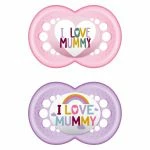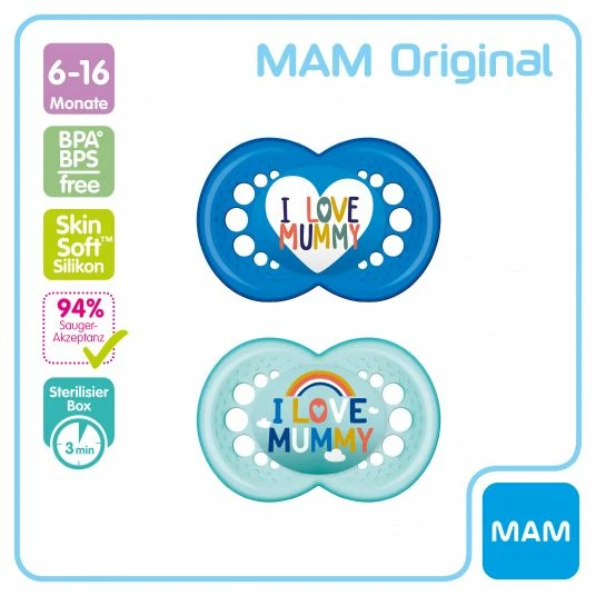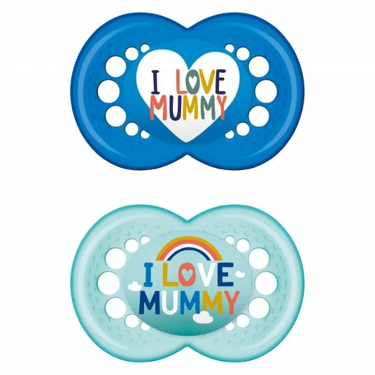 2 MAM Schnuller Original – Silikon 6-16 M – I Love Mummy in Blau & Türkis