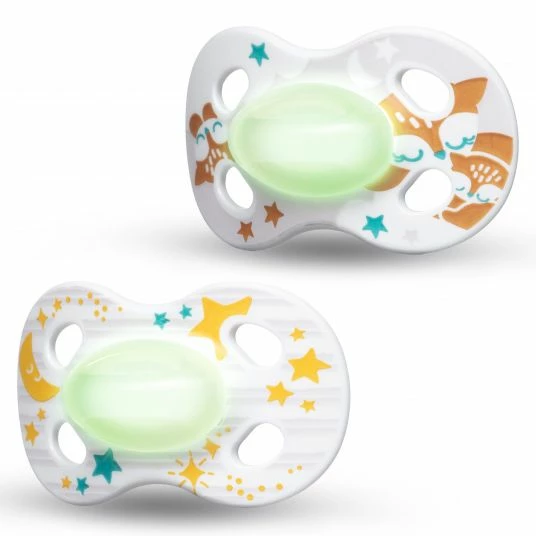 Gerade abends und nachts kann ein Schnuller sehr praktisch sein: Er tröstet, beruhigt und kann beim Einschlafen helfen. Die Medela Schnuller Night & Night DUO im praktischen 2er Set sind dabei genau auf die Bedürfnisse von Babys ab dem 6. bis zum 18. Monat abgestimmt. Die beiden Schnuller leuchten im Dunkeln, so dass Dein Baby seine geliebten Tröster auch in der Nacht schnell wieder findet. Da sie keinen Ring haben, stören sie nicht, wenn Dein Kleines sich im Schlaf bewegt.