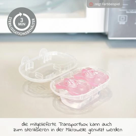 Damit die Schnuller unterwegs sauber verstaut sind und sich ganz einfach reinigen lassen, kommen sie in einem Sterilisationsbehälter zu Dir nach Hause. Selbstverständlich sind alle verwendeten Materialien der hochwertigen, von Experten entwickelten Medela Schnuller BPS- und BPA-frei. Dank der praktischen Transportbox können die Schnuller ganz einfach in der Mikrowelle sterilisiert werden.