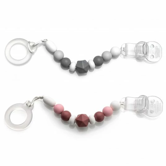 Mit einem Clip ist die süße, besonders leichte Kette mit nur einem Handgriff an der Babykleidung angebracht und wieder abgenommen. So bleibt der Lieblingsschnuller für Dein Baby immer greifbar und kann nicht mehr auf den schmutzigen Boden fallen. Die Kette ist außerdem ein niedliches Accessoire: Mit Perlen in tollen Farben und unterschiedlichen Formen ist sie für die kleinen Babyaugen besonders spannend und motiviert zum Tasten, Greifen und Beißen. Beide Schnullerketten lassen sich abwischen und sind somit sehr pflegeleicht.