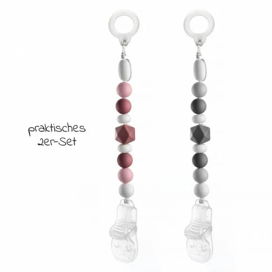 Bei einem Spaziergang, auf einem Ausflug, auf Reisen oder Zuhause: Der Lieblingsschnuller fällt unbemerkt herunter und geht leicht verloren. Damit Dein Schatz seinen Schnuller nicht verlieren kann und er nicht auf den Boden fällt, sichert ihn die MiaMia Schnullerkette im praktischen 2er Pack in Grau und Beere zuverlässig. Dabei ist sie für alle gängigen Schnuller-Marken passend und lässt sich für Schnuller mit und ohne Greifring verwenden.