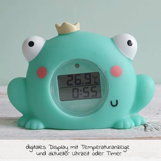 Mit dem Bade- und Raumtemperatur- Thermometer Thermo Bath Magical – Froschkönig von Miniland erhältst Du einen lustigen und wasserfesten Helfer für den Babyalltag. Das Thermo Bath misst Wasser- und Raumtemperaturen schnell und ist ein niedlicher Spielbegleiter in der Badewanne. Dein Schatz kann den süßen Frosch ins Wasser tauchen und bedenkenlos damit spielen. Es erfüllt nämlich auch alle Sicherheitsstandards für Spielzeuge.