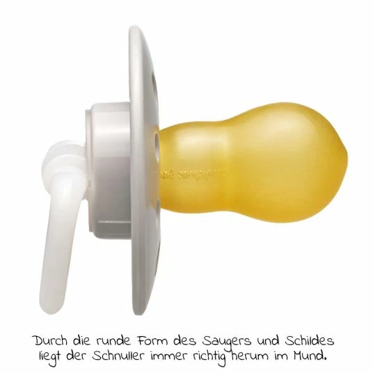 Das runde Mundstück des Saugers ist ähnlich geformt wie eine Brustwarze – so beugt er Saugverwirrungen vor und ermöglicht einen problemlosen Wechsel zwischen Brust und Sauger. Außerdem praktisch: Dank seiner Kirschform liegt der Sauger immer richtig herum im Mund. Er ist der natürlichen Form der mütterlichen Brust beim Stillen nachempfunden und passt sich optimal an den kindlichen Gaumen an.