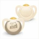 Die festen Teile des Schnullers bestehen aus nachhaltigem Kunststoff. Das Schnullerschild ist mit zwei großen Luftöffnungen versehen, so dass viel Luft an den kleinen Babymund gelangt. Selbst bei der Verpackung der beiden for Nature Schnuller wurde an die Umwelt gedacht: bestehend aus 100% FSC-zertifiziertem Papier, lässt sie sich einfach über die Papiertonne recyceln.