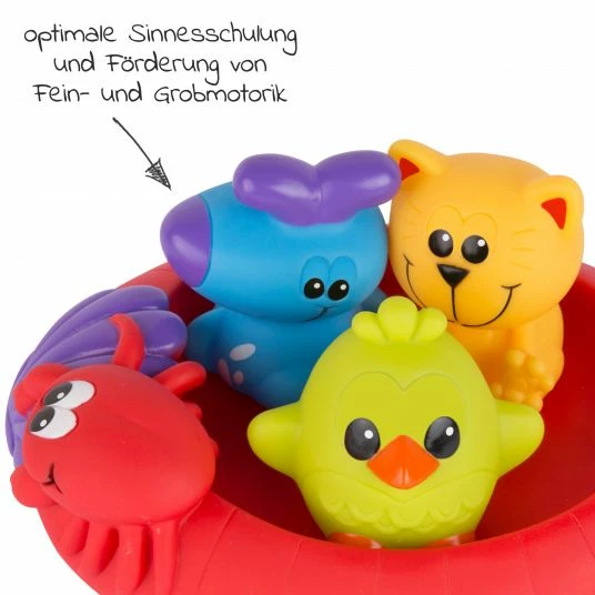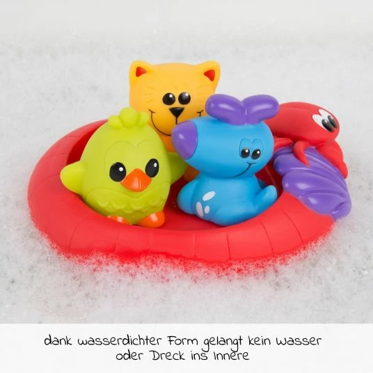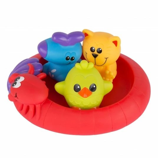 Das Badespielzeug Schwimmende Freunde von Playgro macht Dein Kind zur ausgelassenen Wasserratte. Die 3 kleinen Tierfiguren schwimmen im Wasser oder im dazugehörige Boot. Die Figuren besitzen die ideale Größe für kleine Kinderhände und können auch sehr gut außerhalb des Badezimmers zum Einsatz kommen. Da kein Wasser in das Innere der Figuren gelangen kann, bleiben die Figuren garantiert schimmelfrei. Wenn Du sie vor direkter Sonneneinstrahlung und Temperaturen über 40 Grad Celcius schützt, bleiben sie noch länger wie neu.