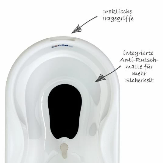 In der Baby-Badewanne Top – Weiß von Rotho Babydesign macht den Kleinen das Baden besonders viel Spaß. Sie können sich darin bequem am abgeschrägten Wannenrand anlehnen. Eine Seite eignet sich hervorragend für Babys. Die andere Seite entspricht den Bedürfnissen von Kleinkindern. Sicheren Halt bietet auf der Babyseite die Antirutsch-Beschichtung. Auf der Kleinkindseite sichert die Sitzposition eine kleine Mulde ab.