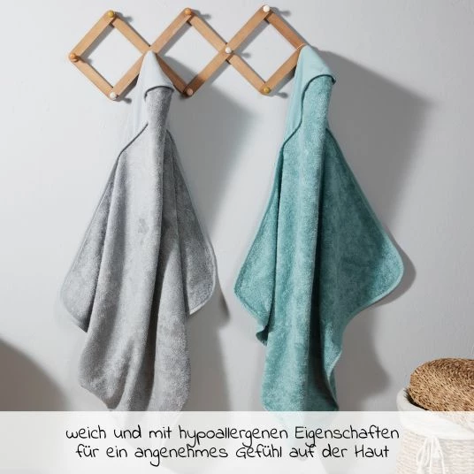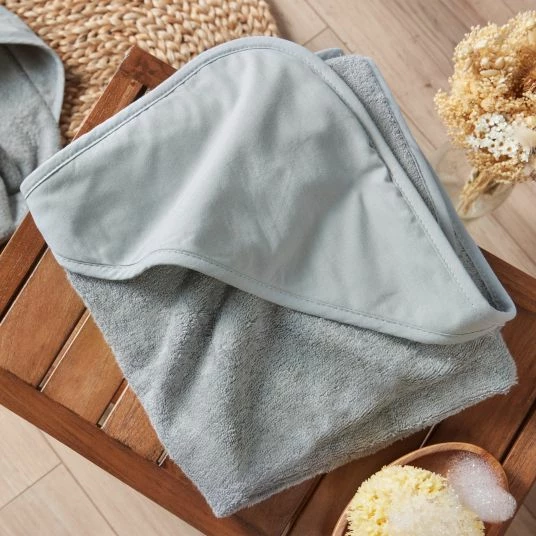 Der kuschelige, umweltfreundliche Stoff aus einem Baumwoll-Bambus-Mix ist sanft und nimmt die Feuchtigkeit auf, gibt sie aber nicht wieder ab. Auf diese Weise fühlt sich das Kapuzenhandtuch nicht so durchnässt an und ist auf der Haut länger angenehm. Das Material ist zudem hypoallergen und eignet sich daher besonders für eine empfindliche Haut sehr gut. Muss es gereinigt werden, kannst Du es bei 60°C in der Maschine waschen.