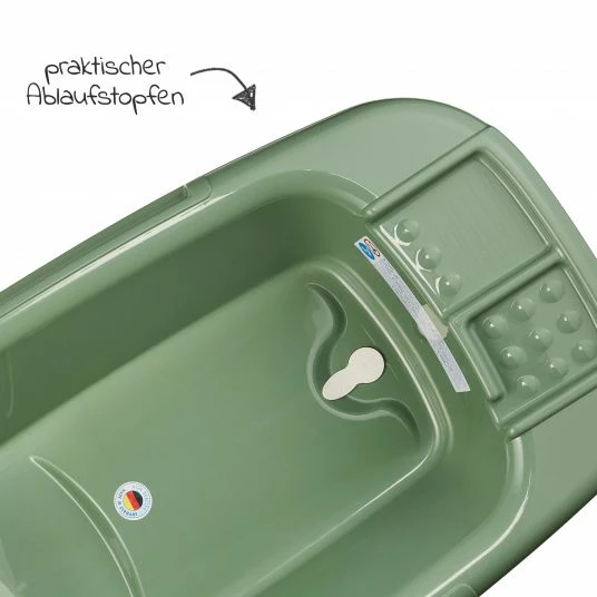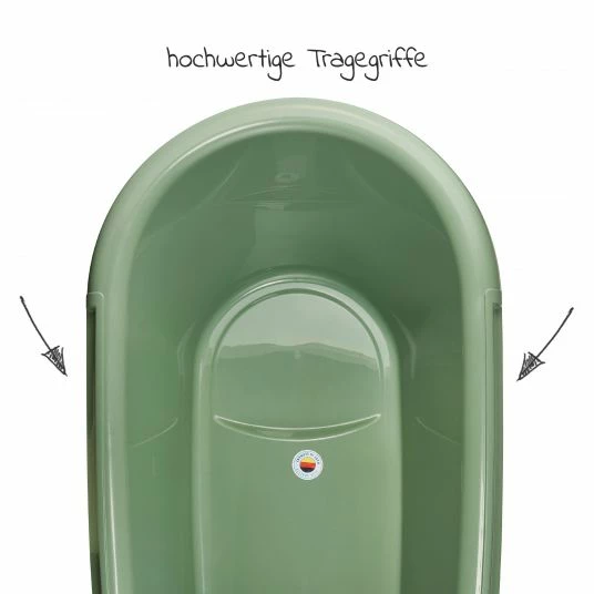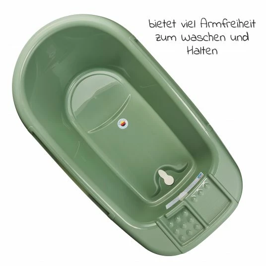Plitsch Platsch, es wird Zeit für das nächste Babybad. Mit dem 3-teiligem Set Badelösung Bella Bambina – Shale Green von Rotho kann Dein Kleines nach Herzenslust plantschen und sein Bad so richtig genießen. In der Wanne ist eine integrierte Sitzmulde, die Deinem Spatz einen sicheren Halt bietet, sobald es selbstständig sitzen kann. Da die Babywanne sehr praktische Maße hat, bietet sie Dir viel Armfreiheit um Dein Baby zu waschen und es zu halten.