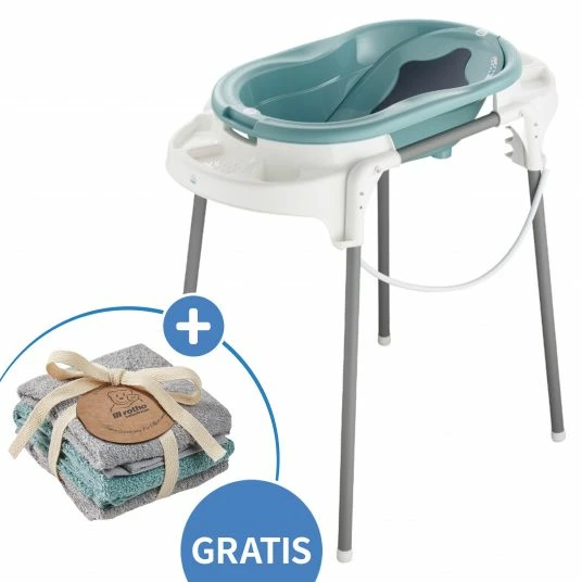 Die Badestation TOP + Gratis Waschtücher 3er pack – Lagoon Stone Grey von Rotho Babydesign beinhaltet alles, was Du zum komfortablen und sicheren Baden Deines Babys brauchst. Das Set besteht aus einer Badewanne mit passendem Neugeboreneneinsatz, einem Badewannenständer und Ablaufschlauch zum anschließenden Ablassen des Badewassers. Die anatomisch und ergonomisch geformte Badewanne Top ist dank ihrer 2 unterschiedlichen Seiten besonders lange nutzbar. zum Set erhältst Du gratis einen 3er Pack Waschtücher von Rotho in den Farben Grau und Grün.